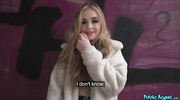 Пикапер заплатил беленькой незнакомке круглую сумму и уломал на секс прямо на улице. Нескромная цыпочка сразу встала на колени и отработала часть платы, используя умелый ротик. После глубокого и слюнявого отсоса блондиночка отодвинула трусики в сторону и согласилась на долбежку в пилотку, от чего и сама кончила.