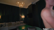 Брюнеточка с интимной стрижкой развела парня на страстный секс и сразу набросилась на член. Цыпочка с огромными буферами и задницей приняла член за щеку и облизала его по всем правилам. Закончив с оральными ласками, красотка в масле дала оприходовать растянутую анальную дырочку и кончила несколько раз.