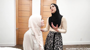 Две мусульманки в хиджабах сначала мастурбировали друг друга дилдо, но быстро переключились на соседа. Сначала красотки поочередно ласкали свои киски игрушкой, разогревая друг друга стонами и поцелуями. Сосед сразу начал оприходовать их мокрые пилотки поочередно, трахая их с позиции первого лица. Он драл их жестко и быстро, заставляя женщин стонать в унисон от кайфа. Обе женщины сошлись в одном неистовом оргазме, их тела содрогнулись. Он облил лица обеих мусульманок горячей спермой, покрыв их густым белым камшотом.