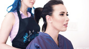 Прямо на работе чернявые подружки запланировали немного пошалить и обильно кончить. Сучки устроили лесбийский секс на рабочем столе и достигли пика наслаждения с помощью шаловливых пальчиков. После этого подружки качественно вылизали сладкие киски и кончили, а в это время две другие подружки резвились на диване.