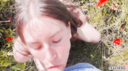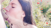 Прогулка по цветочному полю разжигает похоть худой брюнетки. Флиртуя с парнем, она сбрасывает одежду, обнажая худое тело, и опускается на колени, обхватывая его член губами. Слюна капает, пока она заглатывает, а затем он входит в её влажную щель, вызывая стоны. Поле заглушает её вскрики, а она шепчет о публичном кайфе. Толчки ускоряются, и оргазм накрывает её, заставляя выгнуться. Сперма заливает её грудь, и она слизывает капли, утопая в природном разврате.