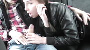 Брюнетка в одежде застукана парнем за ласками с его другом в машине. Она не остановилась, заглатывая член друга, пока её парень смотрел. Камера крупным планом поймала её чавкающие губы и похотливый взгляд. Сперма залила её лицо, а она, облизывая губы, представляла, как они устроят тройничок с её парнем.