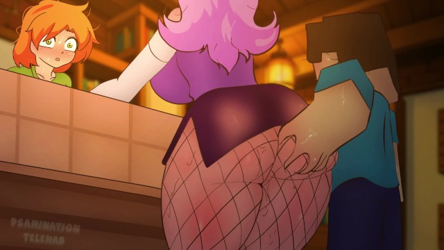 Порно Стив Майнкрафт и Розоволосая девчонка из-за прилавка в чулках в Хентай рисовке