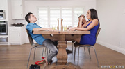 Luna Star прямо во время ужина развела мелкого соседа на страстный секс. Горячая брюнеточка набросилась на большой член и отсосала его по всем правилам. После слюнявого отсоса ненасытная и неверная штучка с интимной стрижкой отдалась в вагину, а в итоге согласилась и на анальный секс в разных позах.