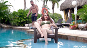 Дамочка с шикарной задницей кайфовала от мастурбации прямо у бассейна. Когда рыженькая милфа насладилась предварительными ласками и привлекла внимание соседа, она нарвалась на жаркий секс. Мадам отсосала член по всем правилам, а уже потом кончила от глубокого проникновения во влажную и бритую пилотку.