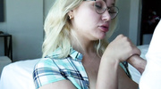 Интеллигентный вид этой блондинки в очках оказывается обманчивым, как только она добирается до мужского достоинства. Девушка с большими сиськами устраивает по-настоящему слюнявый и грязный отсос, заглатывая ствол максимально глубоко. Она не жалеет смазки и слюней, чтобы сделать процесс максимально приятным и скользким для своего партнера. Крупный план позволяет расценить каждое движение её языка и губ, работающих над твердой плотью. В кульминации очкастая сучка принимает на свое лицо и очки густую струю спермы, завершая этот акт чистым и пошлым наслаждением.