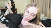 Брюнетка в очках и одежде решила взять инициативу в свои руки и завалила пацана на кровать. Она принялась жадно обсасывать его твердый стояк, стараясь обслюнявить каждую венку на инструменте. Вид от первого лица передает, как ствол полностью пропадает в ротике очкастой сучки под звуки влажного хлюпанья. Девка засаживает агрегат по самую глотку, не боясь запачкать слюнями свои очки и одежду. Парень наблюдает за работой её умелых губ, наслаждаясь видом развратной интеллигентки на коленях. Тщательный и пошлый орал заканчивается тем, что мужик выстреливает мощной порцией спермы прямо на лицо и линзы очков покорной брюнетки.
