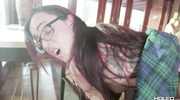 Застав падчерицу за уроками, отчим бесцеремонно задирает её короткую юбку и прижимает девчонку к столешнице. Студентка испуганно вскрикивает, когда мужские пальцы начинают грубо разминать её тугой анус. Без лишних слов мужчина смазывает её шоколадку слюной и вгоняет свой болт в узкое отверстие. Студентка выгибается дугой, чувствуя, как мужской агрегат растягивает её сфинктер до предела. Волосатая киска девчонки намокает от возбуждения, пока отчим заколачивает ей в задницу глубокими и частыми толчками, заполняя всё её естество до самого основания. Инцест-страсть заканчивается тем, что бедняжка полностью обмякает, когда болт прошибает её до глубины под сочные шлепки по ягодицам.