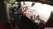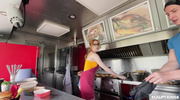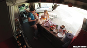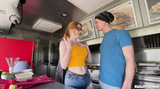 Прямо на рабочем месте рыжая бестия с большими сиськами подставляет свою волосатую пилотку под ствол клиента. Мужик задирает её форму и вбивает болт в промокшую щелку, пока она стонет, боясь быть замеченной. Рискованный трах заканчивается тем, что партнер всаживает последние капли похоти в её нутро, и рыжая сучка содрогается от мощного оргазма прямо за прилавком фудтрака.