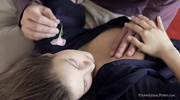 С большими сиськами брюнетка млела от мастурбации парня. Засосав его ствол, она полировала с жаром. Он всаживал член в её пилотку, долбя в позах. Вопли наполняли спальню, её буфера тряслись. Сперма залила её сиськи, капли стекали по коже. Развратница изгибалась, ловя оргазм. Похотливая крошка хихикала от кайфа. Кровать пылала от их страсти.