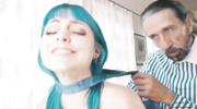 Синеволосая Jewelz Blu с большой грудью покрасовалась перед старым знакомым и легко возбудила его. Сексапильная штучка с синими волосами получила член за щеку и облизала его по всем правилам. Когда цыпочка качетсвенно отработала ртом, она получила трах во влажную и бритую киску и громко стонала, пока не испытала яркий оргазм.