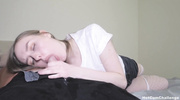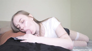 Несмотря на напускную стеснительность, падчерица в чулках очень технично заглатывает ствол своего отчима. Девка опустилась на колени, обхватывая агрегат губами и начиная медленно засаживать его в свой ротик под подбадривания мужика. Крупным планом показано, как болт полностью скрывается в глотке сучки, а её слюни текут по подбородку. Слышно сочное чавканье и причмокивание, пока блондинка полирует инструмент языком. Постепенно она входит в азарт и начинает работать ротиком всё быстрее, принимая стояк по самое основание. Финалом этого запретного орала становится мощный камшот, заляпывающий всё лицо и волосы «стесняшки».