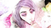 Фигуристая студентка в короткой юбке и чулках показала прелести в татуировках и легко возбудила парня. Косплейщица в это время наслаждалась анальной пробкой, а уже через минуту начала сосать стоячий член. Хорошенько отработав ртом, девка отдалась во влажную вагину, а потом даже обильно кончила от анала и насладилась двойным проникновением с помощью дилдо.