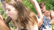 Потерявшись, крошка обратилась за помощью к пикаперам. Малышка получила заманчивое предложение и без лишних слов смочила члены пикаперов слюнями, заглатывая по гланды, и раздвинула ноги. Один долбил её киску, пока она сосала другому, хрипя от кайфа. Оргазм накрыл её, и сперма брызнула на её сиськи. Сучка выдохнула, наслаждаясь кайфом, и легла, задыхаясь от экстаза. Она расслабилась, довольная трахом.