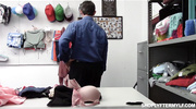 Дамочка с большими и силиконовыми сиськами возбудила мужика в форме и согласилась отсосать ему по всем правилам, чтобы не вызывал ментов из-за воровства. Милфа встала на колени и качественно поработала ротиком. Когда потаскушка сама вошла во вкус, она дала оттрахать вагину в разных позах и прямо на столе.