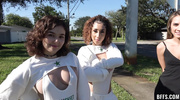 Малышки в купальниках возбудили общего знакомого и развели его на страстный и жаркий секс. Крошки напросились на групповуху прямо на улице и сразу начали демонстрировать умения. Хорошенько отсосав член, развратницы напросились на глубокое проникновение в вагины и по очереди достигли бурного и яркого финала.